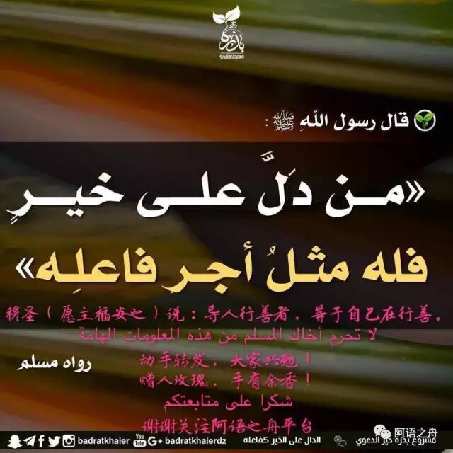 先知(愿主福安之)说:导人行善者,且拥有跟行善者一样的回赐。